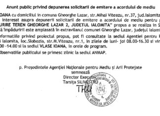 Anunț public privind depunerea solicitării de emitere a acordului de mediu – împădurire teren...