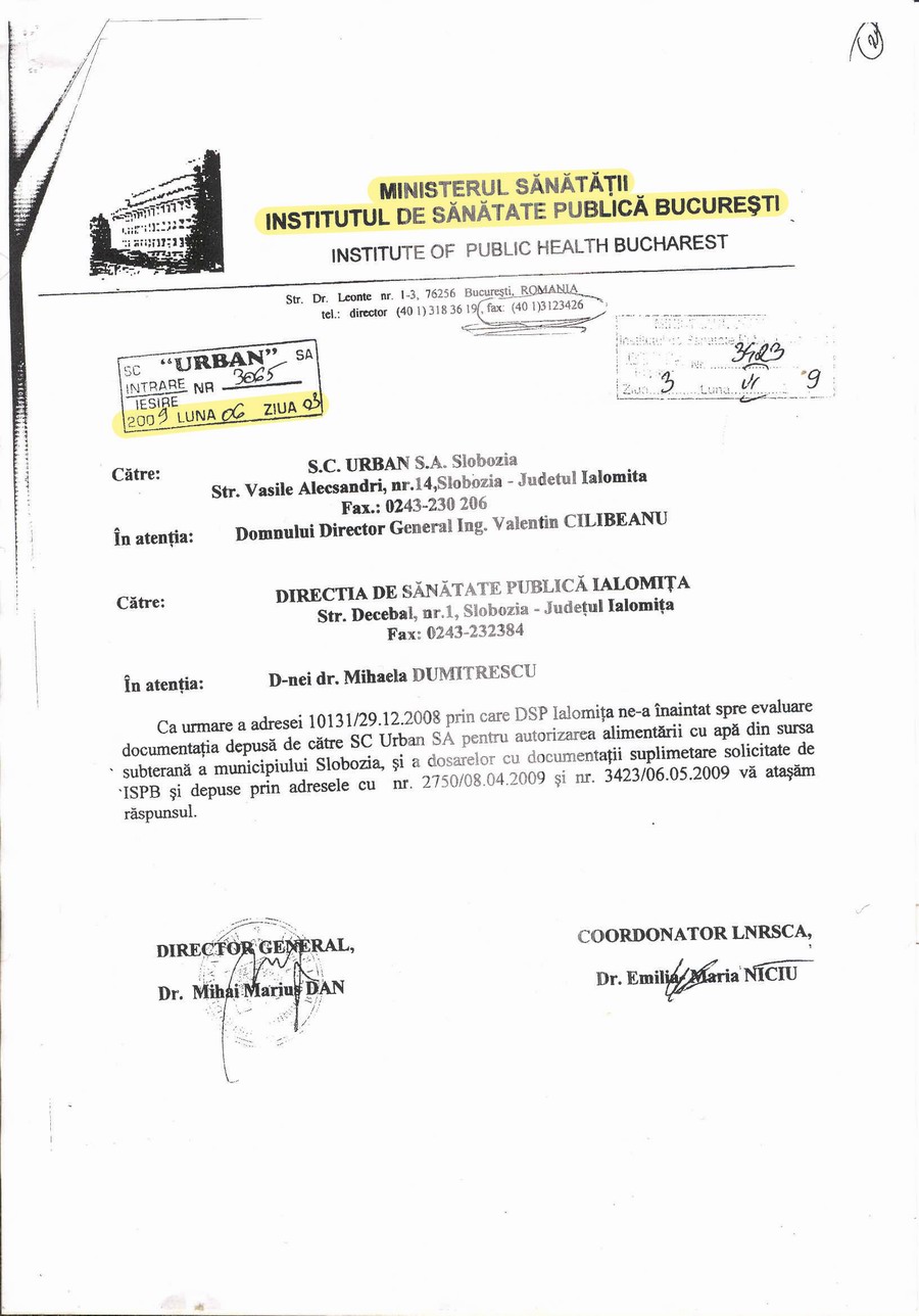 Cu adresa nr.10131 din 29.12.2008, Direcţia de Sănătate Publică Ialomiţa a înaintat spre evealuare, Institutului de Sănătate Publică Bucureşti (ISPB), documentaţia depusă de societatea Urban pentru autorizarea alimentării cu apă din sursa subterană a municipiului. Nu au fost sufieciente documentele depuse, aşa că au mai fost expediate şi alte acte suplimentare, la solicitarea ISPB, în datele de 8 aprilie şi 6 mai 2009. Data obţinerii acestei autorizaţii este 24 iunie 2009, documentul fiind emis de Autoritatea de Sănătate Publică Ialomiţa.