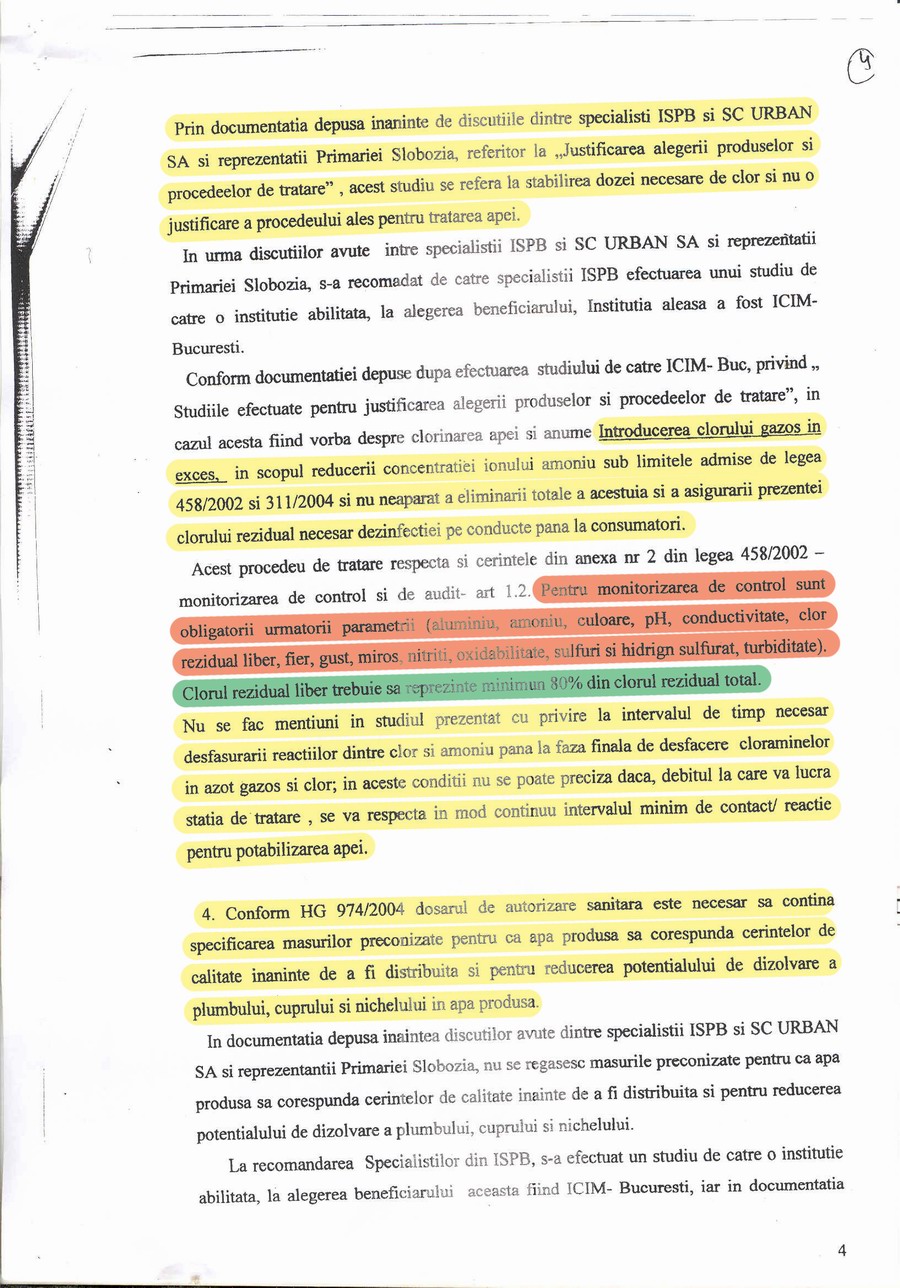 Cităm din raportul ISPB: „În documentaţia depusă înaintea discuţiilor dintre specialiştii ISPB şi SC Urban SA şi reprezentanţii Primăriei Slobozia nu se regăsesc măsurile preconizate pentru ca apa produsă să corespundă cerinţelor de calitate înainte de a fi distribuită şi pentru reducerea potenţialului de dizolvare a plumbului, cuprului şi nichelului“. Tot ICIM a efectuat acest studiu, din care lipseşte planul de măsuri pentru reducerea potenţialului de dizolvare a plumbului, cuprului şi niclelui, cu justificvarea că reţelele actuale nu au în compnenţă cele 3 elemente chimice.