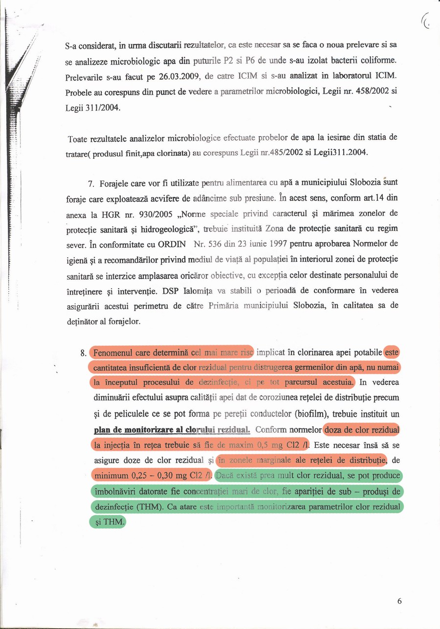 • Deşi primarul Sloboziei încearcă să ne convingă de potabilitatea apei obţinută din sursa subterană a municipiului, investiţie care ne-a costat până acum 151 de miliarde de lei vechi, lucrurile nu stau chiar aşa. Sunt buletine de analiză care demonstrează depăşiri majore la indicatorul „fier total“, dar şi depăşiri la „cloruri“. Mai mult chiar, într-un referat de evaluare al Institutului de Sănătate Publică Bucureşti, pus la dispoziţia societăţii Urban şi Direcţiei de Sănătate Publică Ialomiţa dezleagă o parte dintre enigmele calităţii apei. Documentul a fost emis în urma analizei documentaţiei depuse la instituţia în cauză şi a celor patru întâlniri de lucru la care au participat şi reprezentanţii Primăriei Slobozia şi ai Urban. Din studiul realizat de ICIM (care a realizat studiul calităţii apelor subterane şi analiza eficienţei staţiei de tratare a apei) rezultă că s-au efectuat analize chimice pentru fiecare sursă de apă. După spălarea şi curăţirea forajelor, s-au înregistrat depăşiri la amoniu, sodiu şi cloruri. Rezultatele microbiologice au indicat prezenţa bacteriilor coloforme la puţurile P2 şi P6, iar la puţurile P9, P15 şi P17, numărul de colonii a fost crescut (au depăşit 300). Importantă este şi menţiunea că analizarea microbiologică s-a efectuat pe probele prelevate nu de instituţia abilitată, în speţă ICIM Bucureşti, ci de către beneficiar (probabil salariate ale laboratorului de la Urban). Concluziile Institutului de Sănătate Bucureşti: program de monitorizare a tuturor surselor de apă pentru o perioadă de cel puţin un an; elaborarea unui plan de măsuri pentru ca apa produsă să corespundă cerinţelor de calitate înainte de a fi distribuită; monitorizarea atentă a următorilor parametrii: cloruri, THM (produşi de dezinfecţie), plumb, la produsul finit;