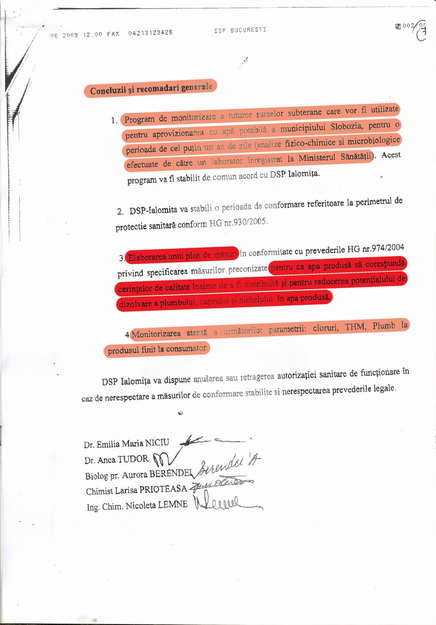 Concluziile şi recomandările generale stabilite de ISPB vizează printre altele: un program de monitorizare a tuturor surselor subterane care vot fi utilizate pentru aprovizionarea cu apă potabilă a municipiului Slobozia pentru o perioadă de cel puţin un an de zile; DSP Ialomiţa va stabili o perioadă de conformare referitoare la perimetrul de protecţie sanitară; monitorizarea atentă a următorilor paramewtrii: cloruri, THM, plumb, la produsul finit la consumator.