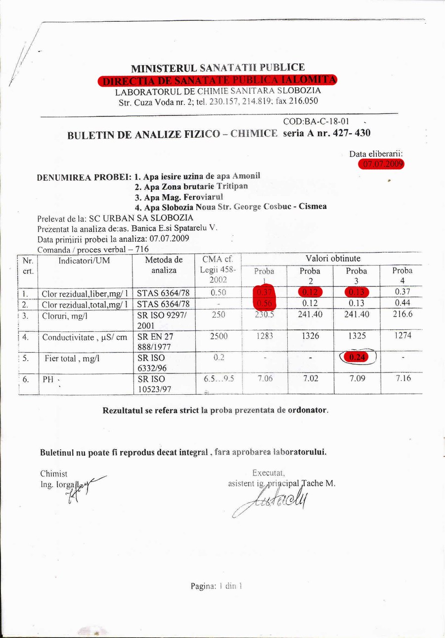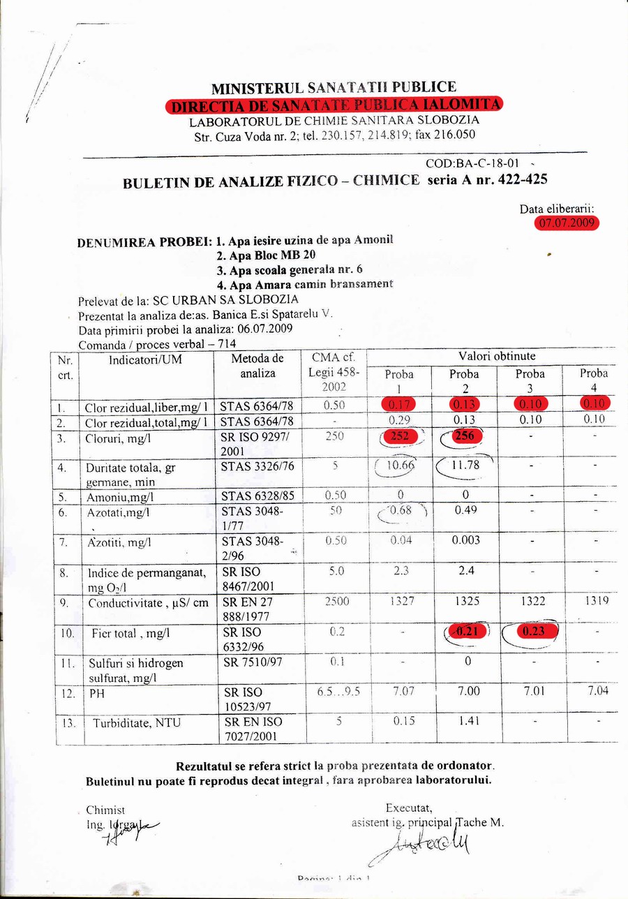 Dosarul de autorizare sanitară trebuie să conţină informaţii care să permită evaluarea calităţii apei la sursă şi variaţiile posibile de calitate şi cantitate pe o perioadă de cel puţin un an de zile (conform HG nr.974/2004). „Deoarece buletinele de analiză chimică depuse până la întâlnirea dintre specialiştii ISPB şi reprezentanţii SC Urban SA şi reprezentanţii Primăriei Slobozia nu au permis evaluarea variaţiilor calităţii apei la sursă pe o perioadă de cel puţin un de zile (…), s-a recomandat de către specialiştii ISPB efectuarea unor analize într-un interval de timp care să acopere perioada stipulată în HG 974/2004, analizele urmând a fi efectuate de către un laborator abilitat, la alegerea beneficiarului“. Acest laborator este ICIM Bucureşti. Conform studiului efectuat de ICIM, s-au efectuat analize chiumice pentru fiecare sursă subterană de apă. „Conform celor precizate de către specialiştii ICIM, s-a recomandat spălarea şi curăţirea surselor (forajele P0-P17). Rezultatele probelor chimice efectuate după curăţirea forajelor au arătat depăşiri la paramentrii: amoniu, sodiu şi cloruri. Celelalte depăşiri care au fost semnalate până la efectuarea studiului de către ICIM (pentru parametrii: PH, Fe, Mn) s-au datorat contaminării acestor puţuri de la uneltele folosite pentru forarea lor.
