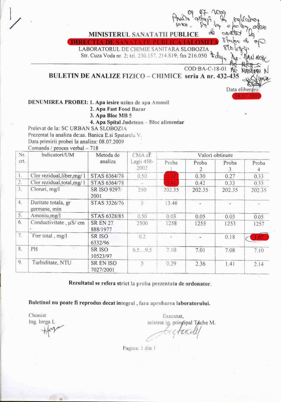 În 7 şi 8 iulie, Direcţia de Sănătate Publică Ialomiţa a emis mai multe buletine de analiză pentru probe recoltate din diverse puncte de pe reţeaua de distribuţie a apei în municipiu. De exemplu, la una dintre probe, prelevate de la blocul alimentar al Spitalului Judeţean de Urgenţă din Slobozia, valoarea la fierul total a fost de 1,07 mg/l, deşi concentraţia maximă admisă este de 0,2 mg/l.Valori depăşite la fierul total s-au înregistrat şi la blocul MB20 şi Şcoala generală nr.6 din municipiu /0,21, respectiv 0,23 mg/l). Remarcăm faptul că, la fier total, nu există vreo valoare la probele prelevate din apa de la ieşirea din uzina de apă. De ce? Să fie doar o acoperire pentru explicaţia că fierul apare în apă „luat“ de pe conducte? Nu ştim. Ştim însă şi la cloruri s-au înregistrat depăşiri (concentraţia maximă admisă este de 250 de mg/l, în timp ce, la unele probe, valoarea a fost de 252 şi de 256 mg/l).