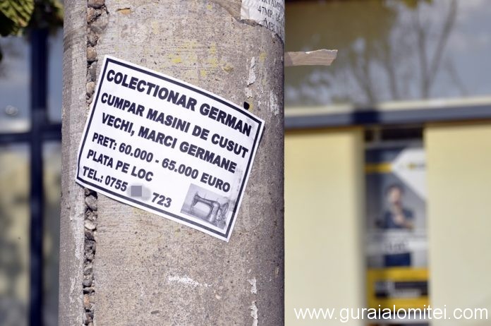 COMUNICAT POLIȚIA LOCALĂ SLOBOZIA: „Poliția Locală Slobozia vă aduce la cunoștință faptul că în data de 1 octombrie 2017, un număr de 25 de minori, elevi ai liceelor din localitate, au fost depistați lipind pe stâlpi, copaci sau clădiri, afișe prin care informau că un colecționar german cumpără mașini de cusut vechi, mărci germane. Fapta comisă de către aceștia, de o gravitate redusă dar care, ținând cont în primul rând de suspiciunile create de mesajul transmis prin textul afișelor, afișe estimate la căteva sute deja lipite din cele cca. 5000 – 7000 primite de către adolescenți ( câte 200 -300 fiecare ), comportă totuși aspecte demne de luat în seamă :