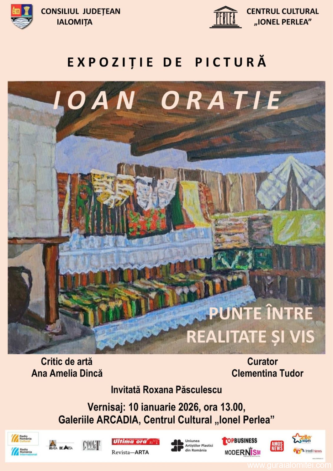 Centrul Cultural „Ionel Perlea” Ialomița a marcat deschiderea oficială a sezonului expozițional 2026 prin vernisajul expoziției „Punte între realitate și vis”, semnată de pictorul Ioan Oratie. Evenimentul a avut loc sâmbătă, 10 ianuarie, la ora 13:00, în spațiul generos al Galeriilor „Arcadia” din Slobozia.