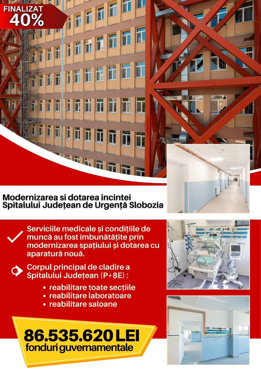 – „Modernizarea şi dotarea incintei clădirii Spitalului Judeţean Urgenţă Slobozia” – 40%;