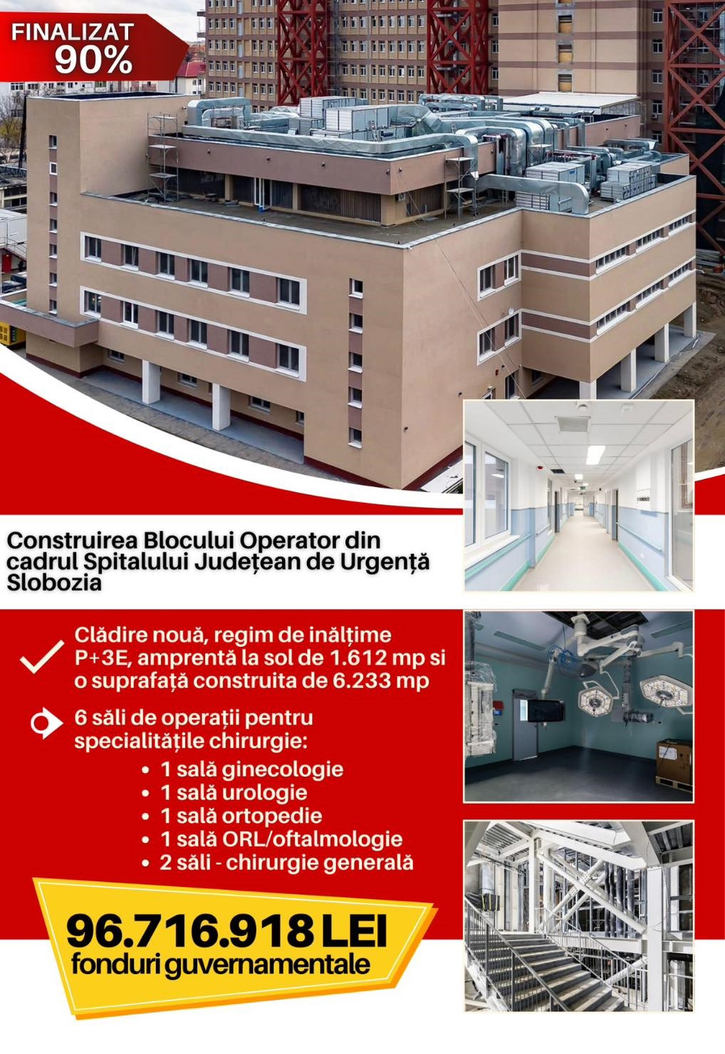 – „Construirea blocului operator din cadrul Spitalului Județean de Urgență Slobozia“ – 90%;