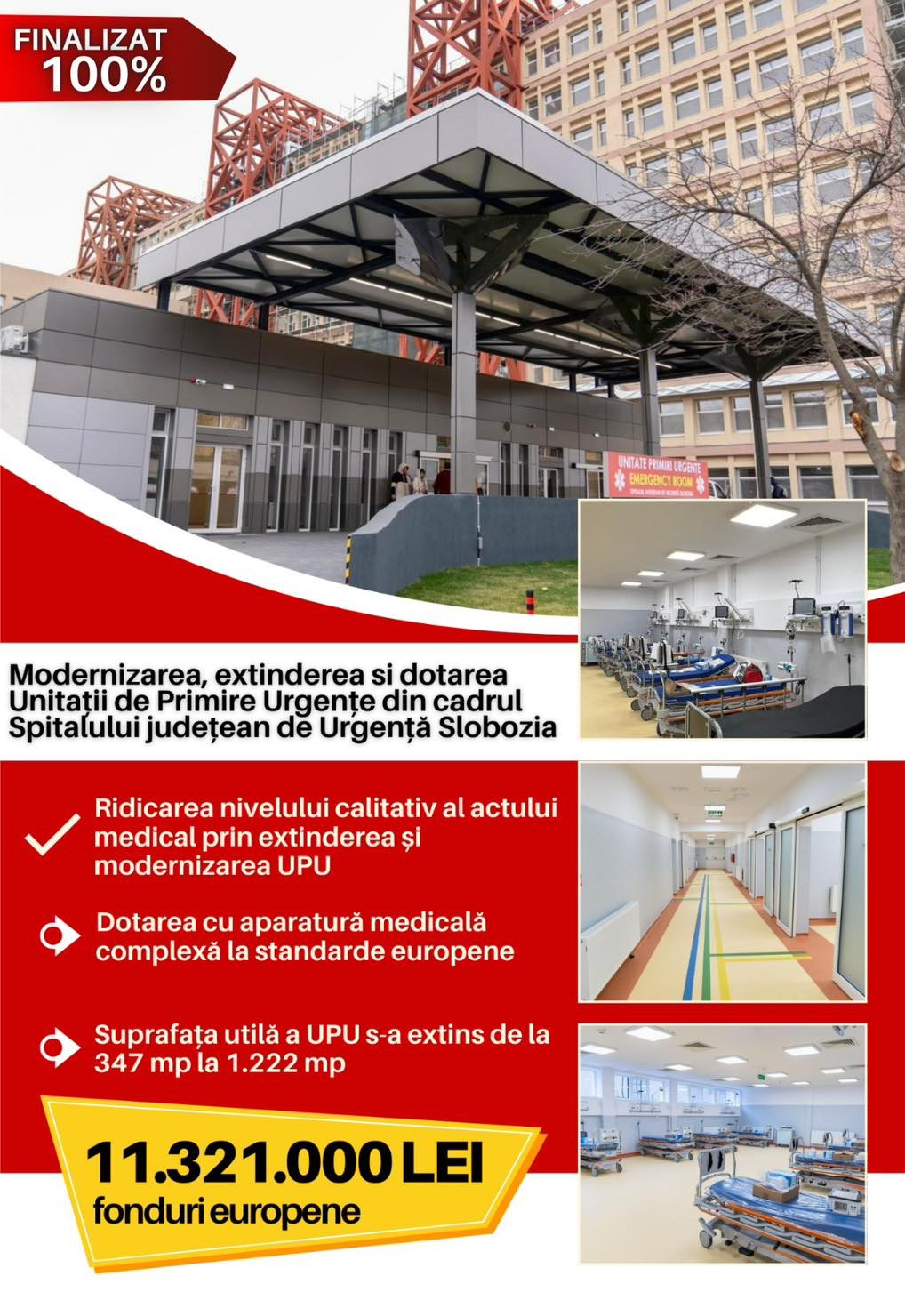 – „Modernizarea, extinderea și dotarea Unității de Primire Urgențe din cadrul Spitalului Județean de Urgență Slobozia” – 100%.