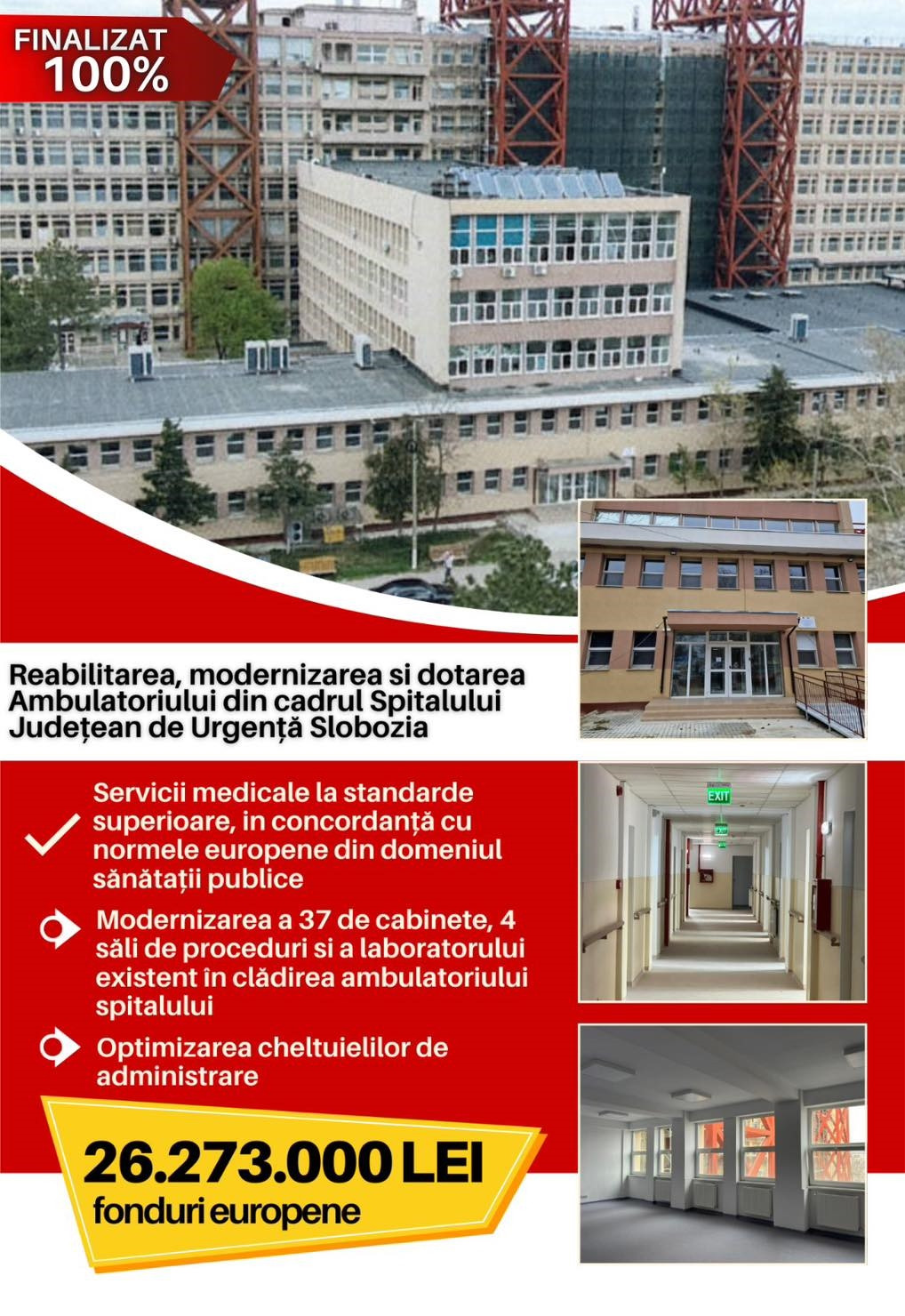 – „Reabilitarea, modernizarea și dotarea Ambulatoriului din cadrul Spitalului Județean de Urgență Slobozia“ – 100%;