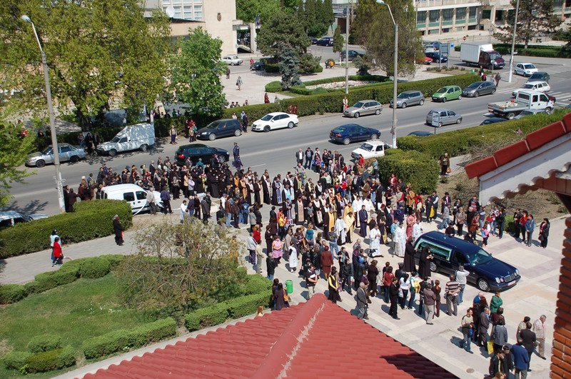 De-al lungul bulevardului Matei Basarb si pe strada Dobrogeanu Gherea, zeci de trecatori s-au alaturat cortegiului. Cu lumanari in maini si cu lacrimi in ochi, credinciosii au insotit trupul neinsufletit al Episcopului Damaschin pana la catedrala episcopala.