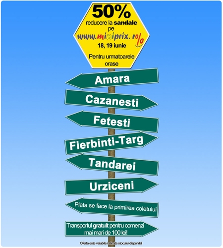 Weekend-ul se anunta plin de surprize pe www.miniPRIX.ro! Comanda online in zilele de 18,19 iunie si daca esti dintr-unul din orasele Amara, Cazanesti, Fetesti, Fierbinti-Targ, Tandarei sau Urziceni ai 50 % reducere la sandalele de dama.