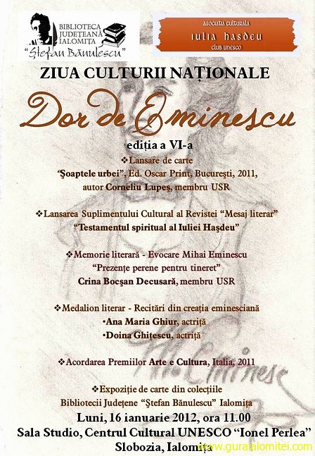 În cadrul manifestărilor ocazionate de ziua naţională a culturii, biblioteca judeţeană şi Asociaţia Iulia Haşdeu, pregătesc pentru publicul din Ialomiţa o serie de întâlniri cu scriitori şi opere prezentate în premieră.