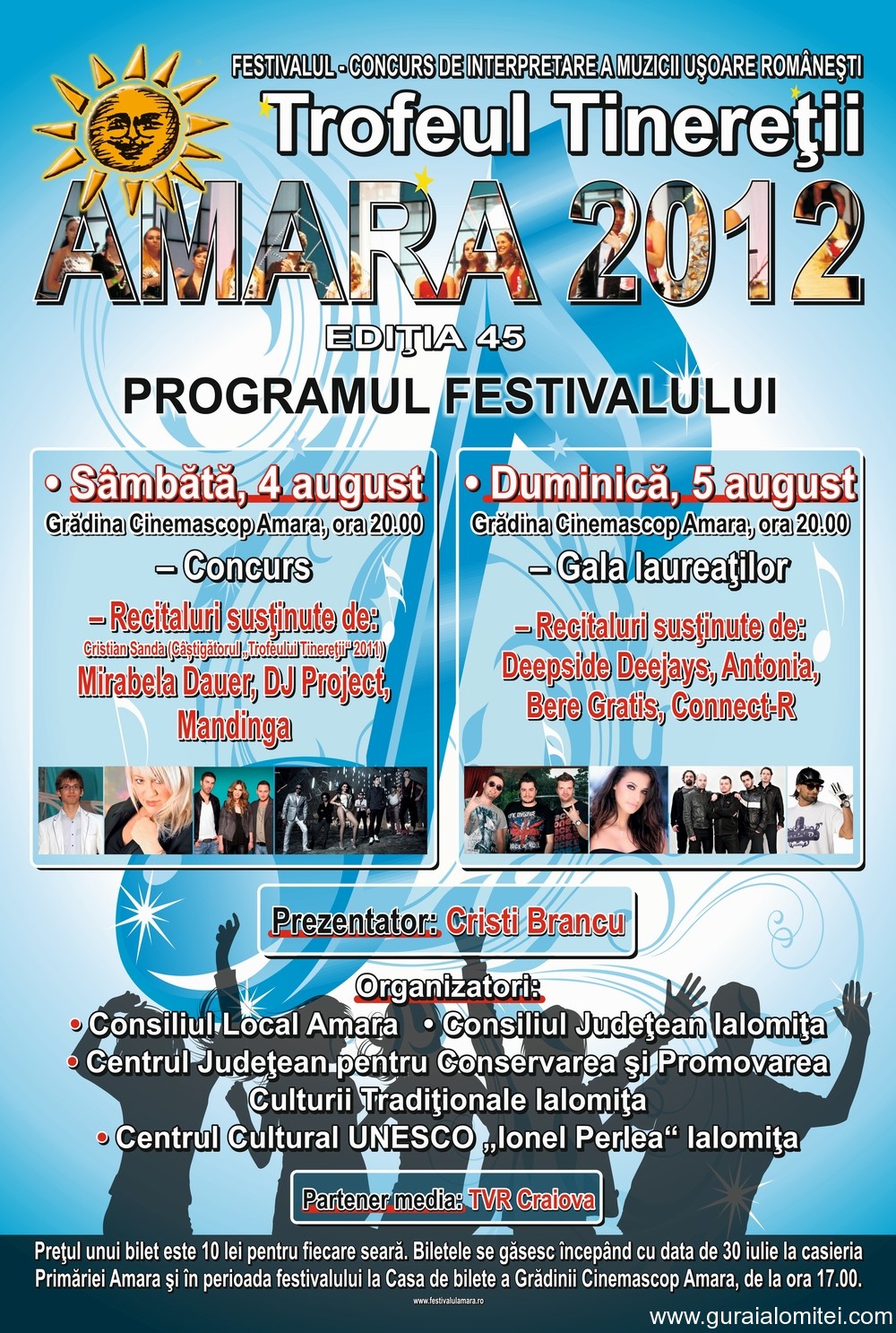 Sâmbătă, 4 august, în recital pe scena Grădinii de Vară din Amara vor evolua Cristian Sanda, laureatul de la ediţia 2011 a festivalului tinereţii, Mirabela Dauer, DJ Project şi Mandinga.
